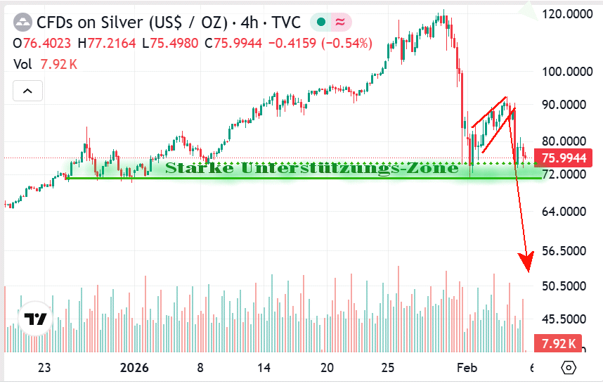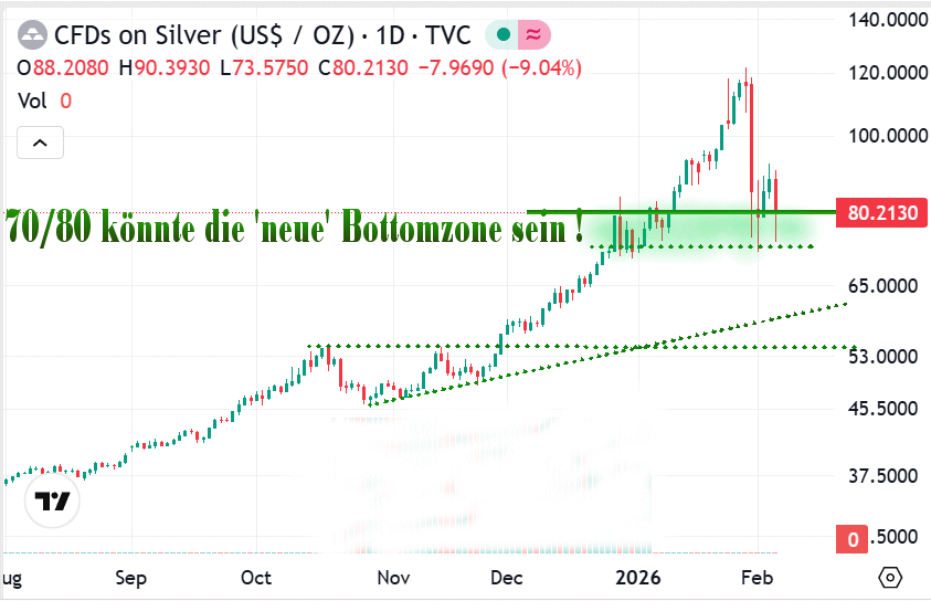 Allerdings möchte ich auch an den Chart von A.Tiedje zum Silber erinnern, der genau bei 120 $ eine Korr.welle 4 bis auf das Ausbruchsniveau bei 50....sogar bis 45 $ einzeichnete und sich auch nicht an