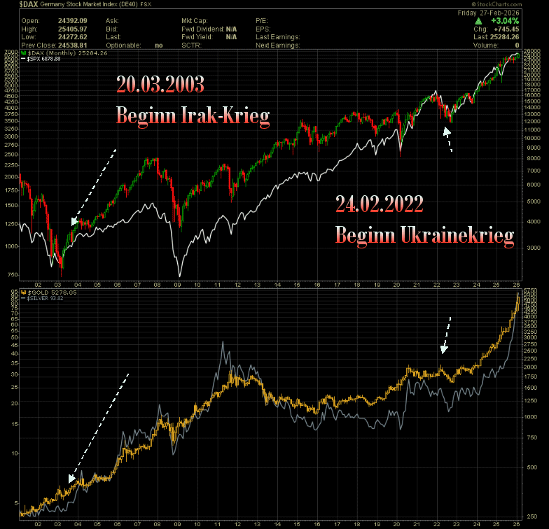Oben Dax/SPX in weiss. Unten Gold/Silber in grau. Im Langfriistchart keinen nenenswerten 'Ausschläge/Trendänderungen' in einer der Assetklassen erkennbar.