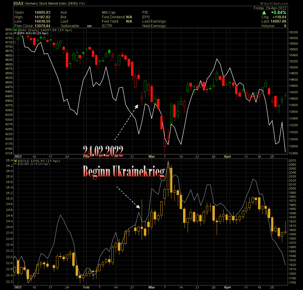 Oben Dax/SPX in weiss. Unten Gold/Silber in grau. Im Langfriistchart keinen nenenswerten 'Ausschläge/Trendänderungen' in einer der Assetklassen erkennbar.