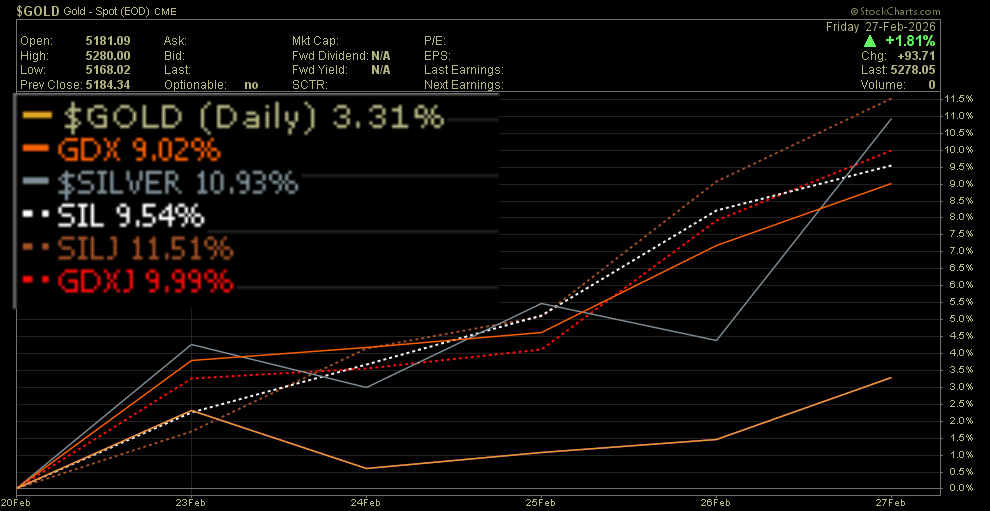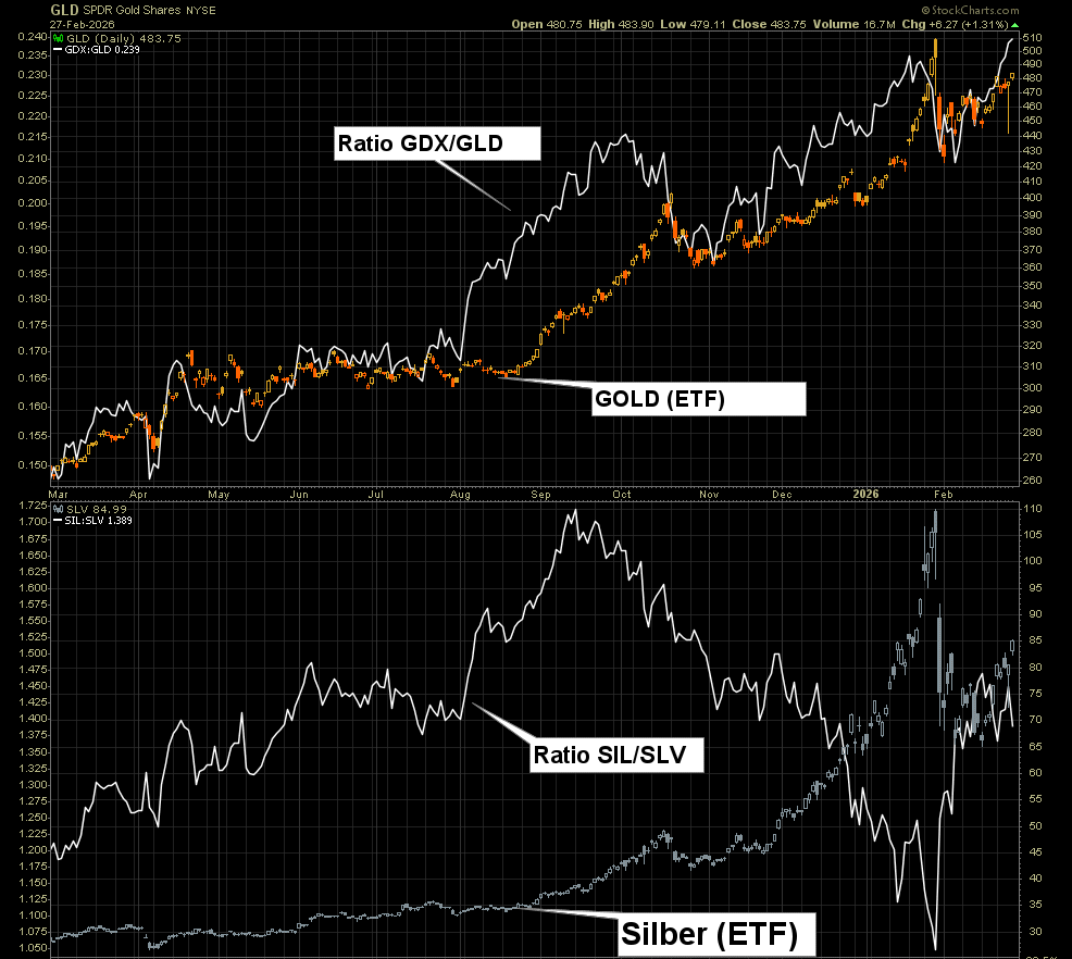 Leider muss man feststellen , dass die 'relativ gute' Performance der Silberminen (SIL/SILJ) immer noch 'unterproportional' verläuft: