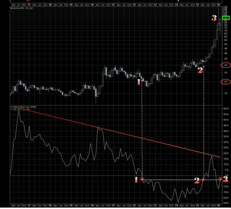 Während die Goldminen (relative Performance zum Goldpreis !!!) auf ein neues Hoch 'ausbrechen' (und neue Hochs bei Gold ankündigen ? ) , verbleiben die Silberminen auf einem Niveau, das dem von Silberpreisen um 20 bzw. 30 $ entspricht ! ( :/ :rolleyes: =O )