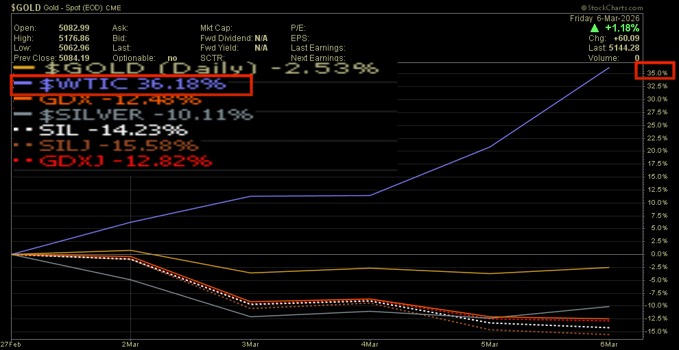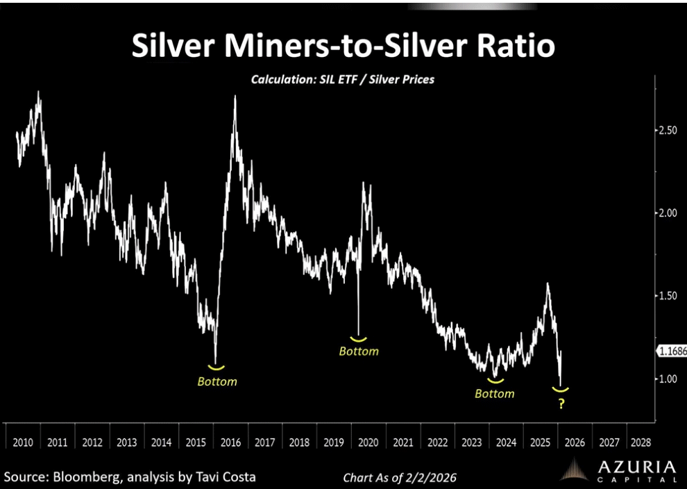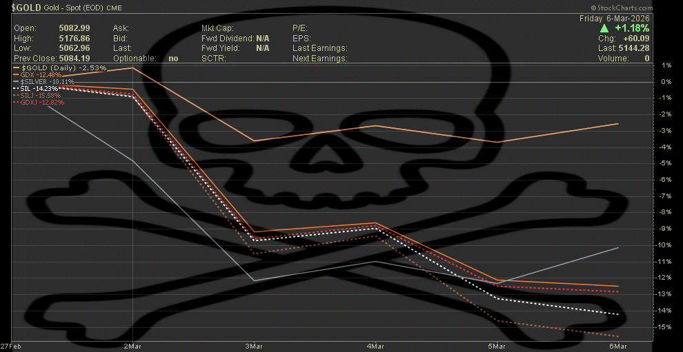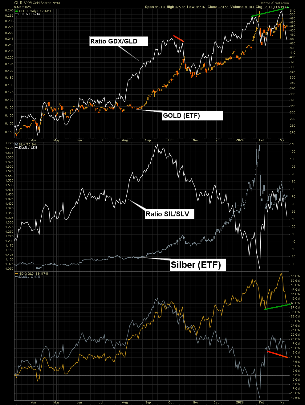 Die 'bullische Divergenz' die wir in der Goldminenperformance relativ zu Gold letzte Woche gesehen haben hat sich nicht 'ausgespielt'. Mal sehen ob sich die relativ bärische Divergenz der Silberminenperformance in Bezug zu der Goldminenperformance nächste Woche in Silberpreisverfall ausspielt ?