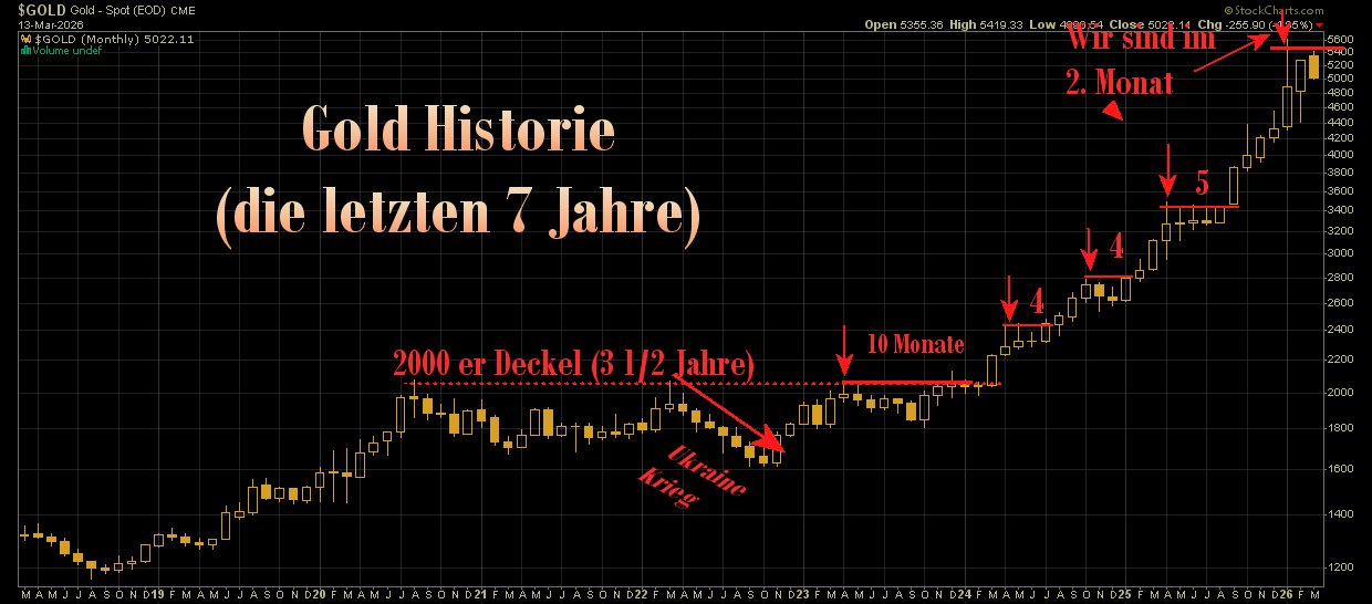 Ich bin lange Zeit, eigentlich bis gestern, davon ausgegangen, dass wir uns im 'Endspiel' des Kreditgeld-Systems befinden, die Grenzen der Schuldentragfähigkeit erreicht und überschritten sind, und dass man sich auf Systemseite bereits eine 'Neu-Aufsetzung' in Vorbereitung ist. Aus diesem Grund war ich von einer kurzen Korrektur überzeugt...möglicherweise sorgt jetzt ausgerechnet eine neue 'Öl- und Wirtschaftskrise' für eine wie auch immer geartete 'Verlängerung'.