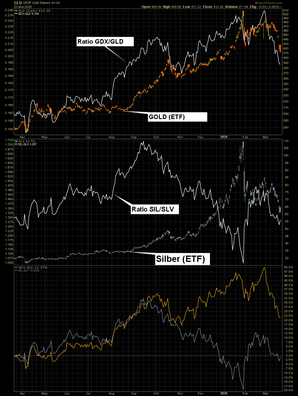 Die Minen kommen wieder gegen Gold nicht richtig vom Fleck, unglaublich! Punktlandung beim Drehpunkt. Wahnsinn, dass die Minen nie richtig aufholen können.