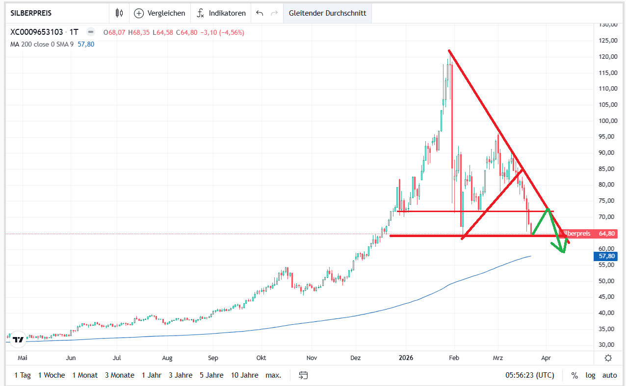 Wenn nun auch die Unterstützung bei 64 USD bricht, ist der Weg zur 200 Tageslinie, aktuell bei ca 56 USD frei. Sind wir gespannt ob diese hält und interessante Einstiegschancen bietet. Ebenso sind wir dann nahe den Hochs von Okt und Dez 2025.