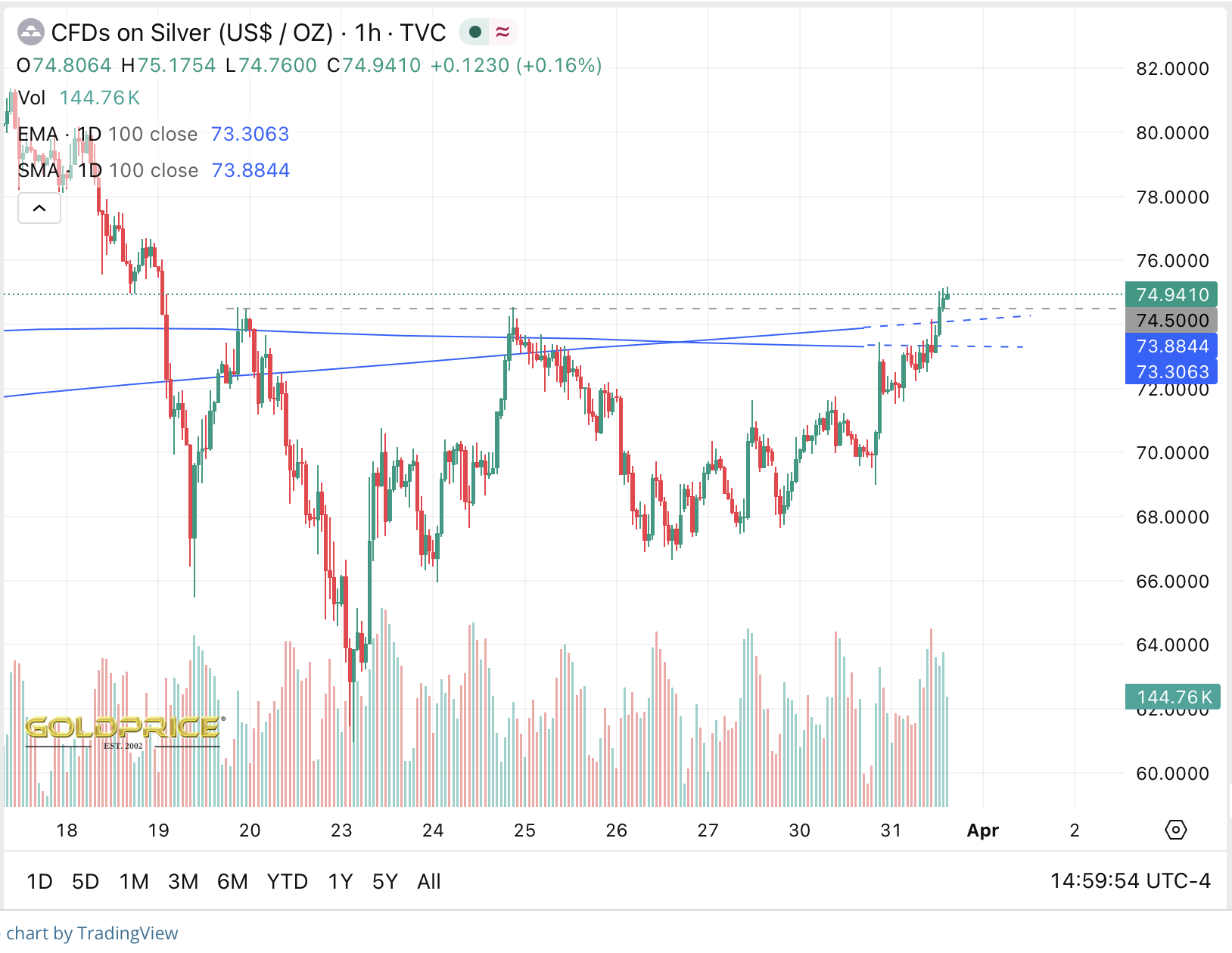 Bei Silber hatten sich die beiden 100er schon am Freitag geschnitten, der von oben kommende und heute bei 73,30 $ liegende EMA 100 brauchte etwas Bearbeitung.