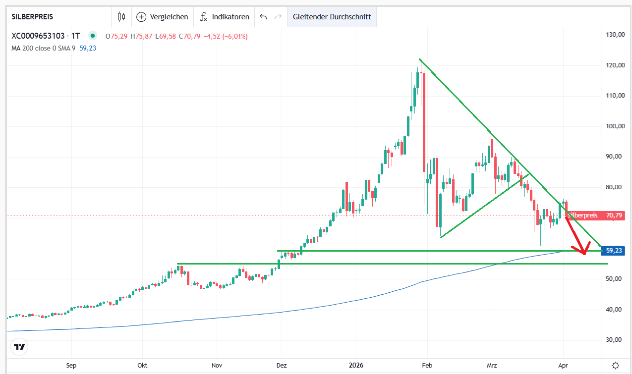 Bei Silber hatten sich die beiden 100er schon am Freitag geschnitten, der von oben kommende und heute bei 73,30 $ liegende EMA 100 brauchte etwas Bearbeitung.