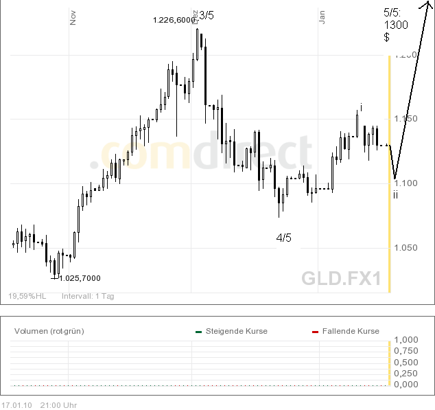 Die Marke 1168 wurde bisher nicht überboten. Die Fehldaten vom 24.12. erschweren eine genaue Interpretation. Vermutlich aber dehnt sich die korrektive Formation weiter aus, wie angedacht. Angenommen wird bei 162 der Abschluss einer ersten Formation in der b2 oder gar die b2 selbst. Dies wird sich zeigen. Im ersten Fall sollte in der folgenden Woche der grüne Zielbereich erreicht werden. Im zweiten Fall würde gar ein neues Low erreicht (min. 1067).