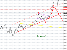 Allerdings, so meine Einschätzung, wird sich, sobald das expandierende Dreieck nach oben verlassen werden sollte, eine schnelle Aufwärtsbewegung entwickeln. Die shoulder-head-shoulder beim S&P zielt auf minimal 1300 !