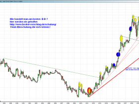 Nehmen wir uns zunächst diese vermeintliche Trendlinie vor. Eine Trendlinie ist die Verbindung einer Serie von Tiefs oder Hochs in einer Preiskurve. Der Aufwärtstrend ist charakterisiert durch die Verbindung der Tiefs: bei handwerklich korrekter Verbindung vorausgegangener Preistiefs kann ich nirgendwo die 'Aufwärtstrendlinie' Herrn Rethfelds im Chart wiederfinden. Charttechnik ist keine Wissenschaft und ganz besonders schräge Linien in Charts , sind immer subjektiv und vom 'Auge' des Betrachters abhängig. Es ist sicher legitim grobe Trends auch in Ratio Charts zu analysieren. Aus derart willkürlichen Linien aber 'Unterstützung' abzuleiten wie es Herr Rethfeld tut, scheint mir in höchstem Maß obsolet . (Zitat: Die oben eingezeichnete Aufwärtstrendlinie kann sich als bedeutsam erweisen, da sie eine langfristige Unterstützung der Ratio darstellt. Hält die Unterstützung, so würde sich von jetzt ab der Goldpreis schwächer als der Dow Jones Index entwickeln. )