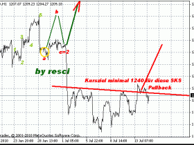 Anschließend sind die Kurse wieder über die 1,215er Marke getrieben worden. Auch ein weiterer Angriff von oben auf diese Marke scheiterte (rechte Schulter). Dann hatte es wohl auch der Letzte kapiert, dass der Markt hier nach unten abgesichert ist.