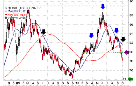 "... Price has fallen below the neckline in a ‘head and shoulders’ formation at the purple arrow. This pattern sets up a target at 71. The black arrow points to the fact that the 50DMA is moving into negative alignment with the 200D. When that happened in June 2009 the dollar fell for six months. Longer term the dollar has been in a downtrend since 2002 when it was ‘120’ on the index. When the dollar drops, everything expressed in dollars tends to rise, be it oil or gold..."