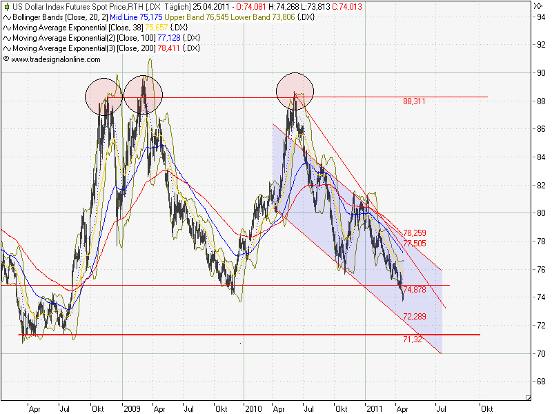 Anm. : 1. untere Trendlinie heute bei ca. 1450 $, 2. und unterste Trendlinie heute bei ca. 1380 $.