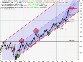 " Das Gold bewegt sich in einem sich öffnenden Chartkeil aufwärts. Der Rückschlag nach einem Fibonacci-Hoch Nr. 8 führte systemgerecht bis auf eine der Trendlinien hinunter. Falls jedoch diese Linie (nach einem Doppelhoch) nach unten hin durchschlagen werden sollte, kann eine der unteren Trendlinien erreicht werden.