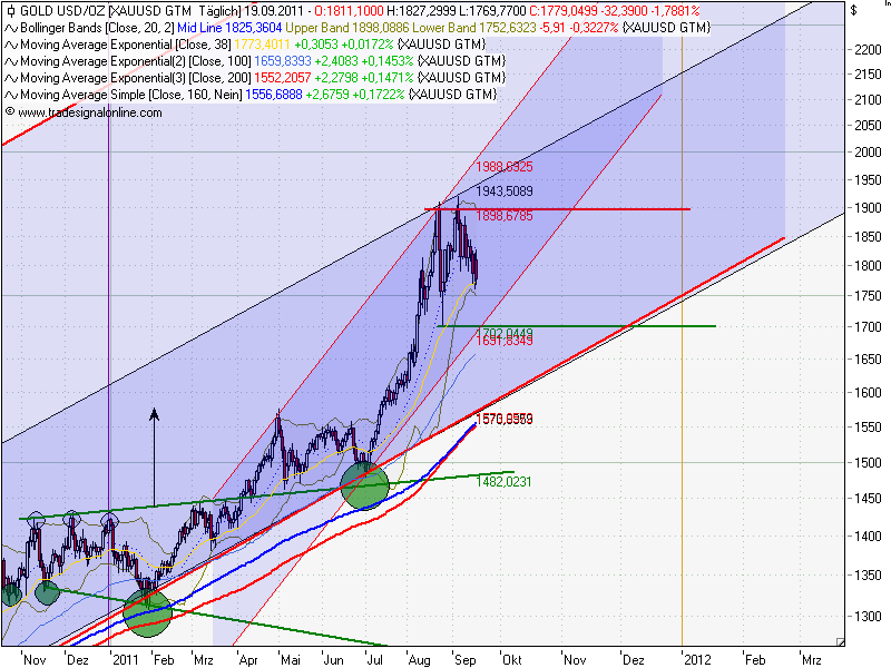 " Das Gold begann nach einem Doppelhoch 8 und 9 hinunterzulaufen. Dies kann über die weiteren Hochpunkte 9 bis 13 geschehen. Der fundamentale Hintergrund ist offensichtlich darin zu suchen, dass die US-Notenbank erkannt hat, mit der ungehemmten Gelddruckerei das Gegenteil des angestrebten Effektes zu erreichen, nämlich eine angehende Inflation, die das Wirtschaftswachstum hemmt. Hierzu stand bereits im letzten Brief: "Falls jedoch diese Linie (nach einem Doppelhoch) nach unten hin durchschlagen werden sollte, kann eine der unteren Trendlinien erreicht werden. Die US-Währung ist jedoch infolge der 24 Billionen Staatsschulden derart angeschlagen, dass das Gold die einzige Absicherung gegen einen Crash bietet."