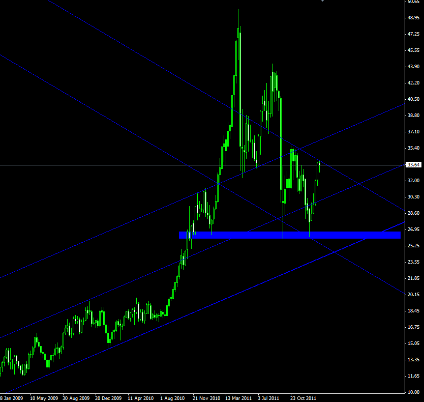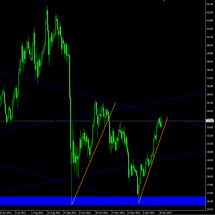 Nehmen wir an es wird eine verkehrte SKS Formation geben. Falls, Silber den Abwärtstrendkanal verlassen sollte, bleibt er im oberen Aufwärtstrendkanal. Wenn er $34,20 nicht brechen kann, sollte er in den unteren Aufwärtstrendkanal runter rutschen und den alten Support um $27 wieder testen. Dann müsste auch irgendwann der Kopf für eine SKS fertig sein und ne Rakete für eine neue Schulter bilden.