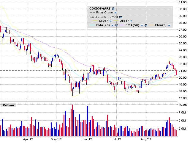 GDXJ (Junior-Aktien -ETF) sitzt aktuell auf dem 50 EMA. Seit März erwies sich der 50 EMA als schöne Trendlinie, die zu Beginn August nach oben überschritten wurde. Schauen wir mal, ob die Erholung gegen Börsenende NY kommt.