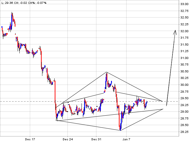 Beim SLV (Silber ETF) ist ein Diamond-Bottom erkennbar. Am besten sieht man ihn, wenn man schon einen Schluck über den Durst getrunken hat..... (aber nicht zuviel, sonst wird es ein Mercedes-Stern...)Was bedeutet, dass sich noch einen Tag lang gar nix tut und dann der Kurs von Silber den Ausgang findet und scharf nach links abbiegt zu neuen Höhen.