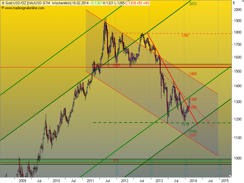 meiner Meinung nach hat sich die Situation aufgehellt. Es sieht gut aus. Die 38er in Woche wurde zurück erobert und auch der steile Abwärtstrend wurde durchbrochen. Kurzfristig sollte es bis 1330-1350 gehen, dann aber wieder eine kleine Korrektur und längere seitwärtsphase. Die starke Rally sollte eigentlich erst in 2015 eintreten...