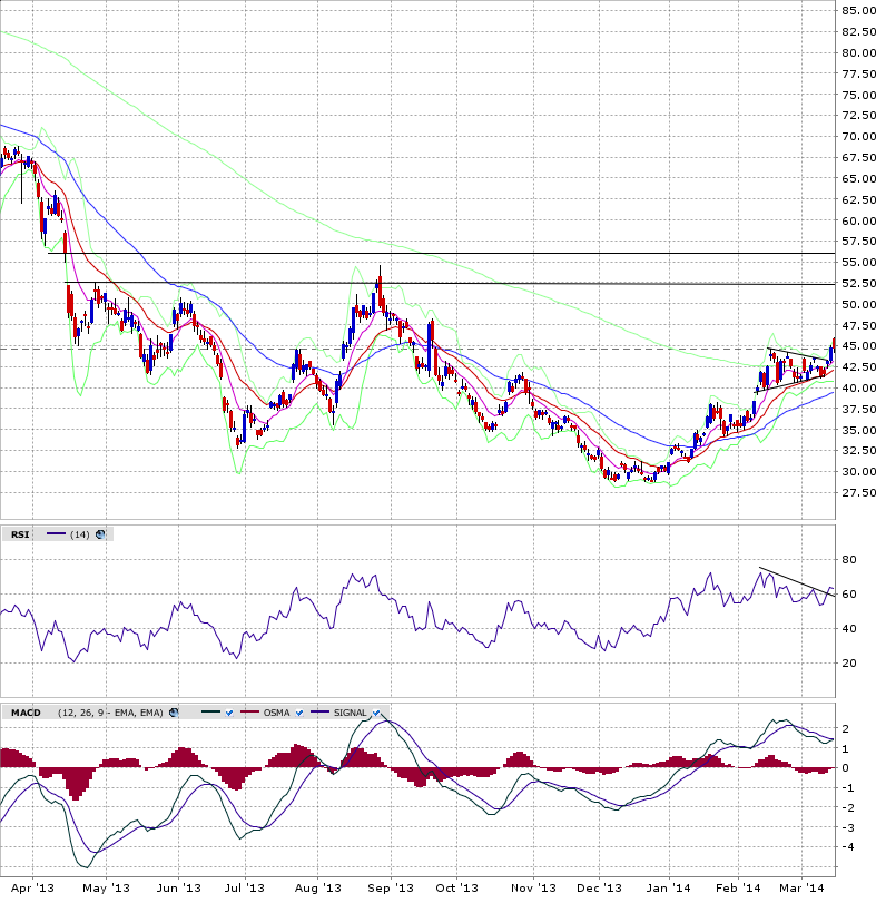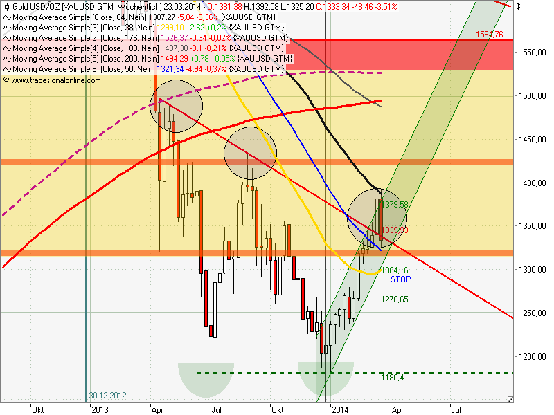 unter die drei markanten Tiefs von 2011/12 nach dem ATH, und dann als Widerstandslinie über das Top letzten August und das von letzter Woche.Allerdings, geht Gold über diese Linie drüber, ergibt sich ein Potential von plus 200 Dollar über die 1350, ungefähr. Aber vielleicht erst für 2015.