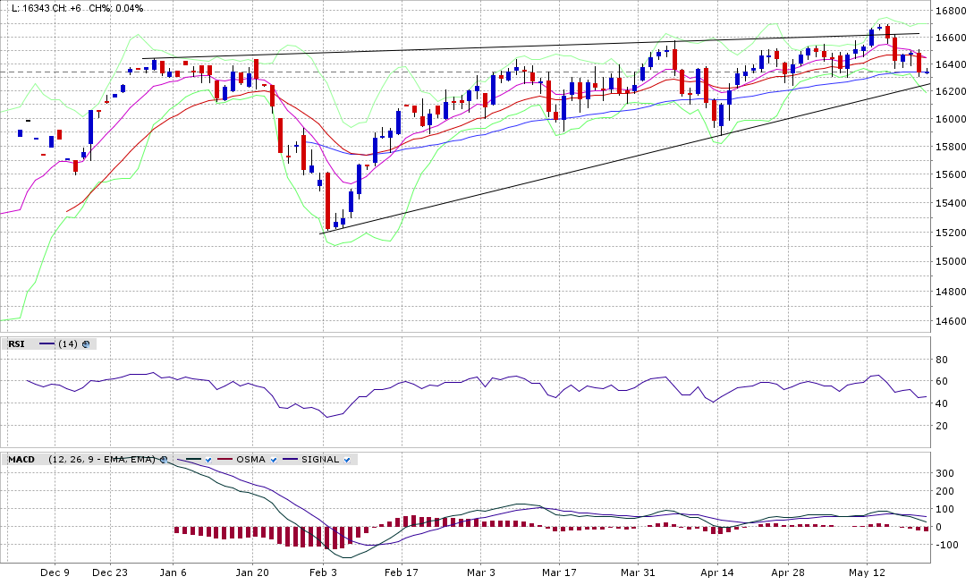 Hier der Dow Jones Future. Gestern setzte der 9 MA (rosa) den Deckel drauf. Der 50 MA (blau) hat in Vergangenheit oft (oder leicht darüber sogar) gehalten. Hier scheint aber keine ausgeprägte Stärke zu herrschen. Gleich unterhalb kommt aber noch die Trendlinie, deren Bruch natürlich nicht gut für die Bullen wäre.