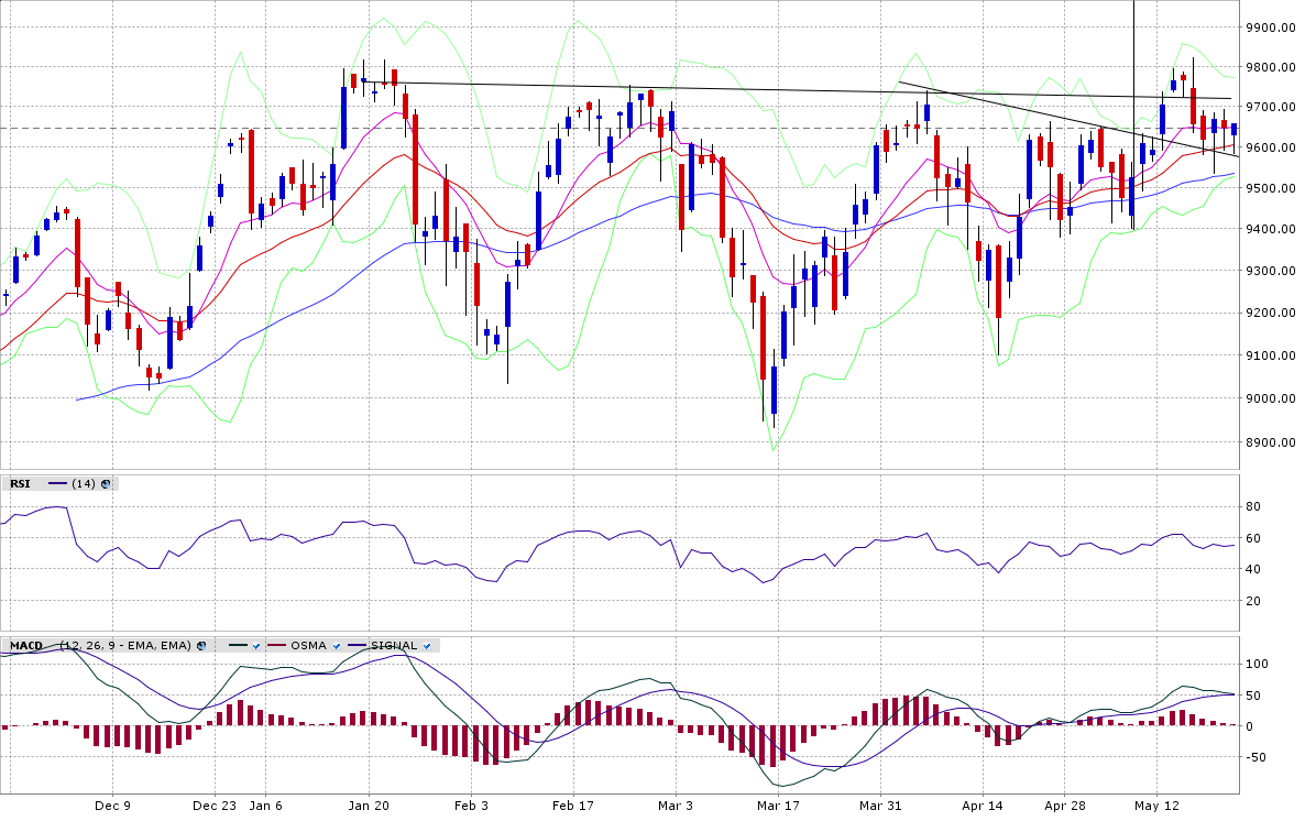 ...und noch der Dax. natürlich ähnlich wie die US-Aktien. Sieht irgendwie eingeklemmt aus. Der Ausbruch gelang nicht, aber ein Reversal ist dies bisher auch nicht. Bei Tagesschlüssen oberhalb 9700 oder unterhalb 9600 kann es wieder interessant werden. Dazwischen herrscht Langeweile.