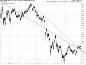 Eigentlich erst über 22$ sind klare Kaufsignale. Viel zu sagen gibt es nicht, der chart sagt schon alles, immer noch klarer Abwärtstrend. Auch schwächelt Silber gegenüber Gold.
