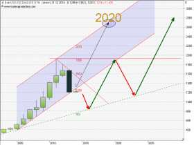 Also dann, 800-850 und dann wieder rauf aufs alte Hoch. Für diese Rechnung gibt es auch klare Rechenbeispiele: siehe Top 1920$, dann die erste Unterstützungszone 2011/12, dann die nächste Unterstützungszone 2013/14....... - alles fast gleiche Abstände. Das gleiche Spiel könnte man machen wenn man den Chart auf den Kopf stellt.
