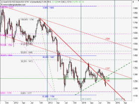 Vielleicht rentiert es sich, nur so zum Mega-Zocken, ein Faktor minus-8-Zertifikat auf Gold zu kaufen, wenns nächstes Jahr an der fallenden Dreieck-Widerstandslinie hängenbleibt.