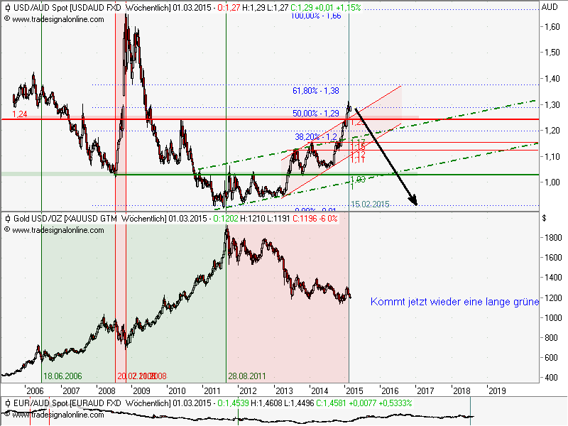 Ich habe mal versucht eine korrelation zu finden..Hier sieht man die Rohstoffwährung AUD, die schön mit dem Goldpreis verläuft. Habe wir einen Wendepunkt bei 50er $/AUD..?? Wenn ja, sollte Gold hier den Boden finden und endlich drehen.