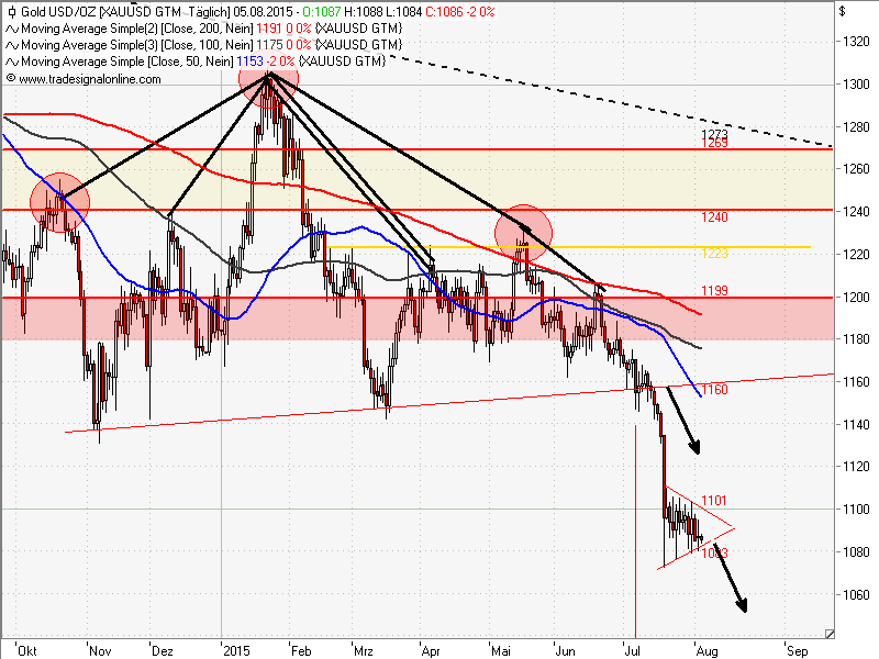 Nachdem sich der Goldpreis 2 Jahre über der 1200$-Marke gehalten hat, ist er zuletzt unter 1100$ gesunken. Der Fall unter die 1200er Marke hat zwar länger gedauert, als ich dachte – mein langfristiges Kursziel von ca. 600-900 $ bleibt dennoch erhalten...