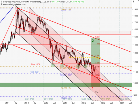 Es gab in der Welt bzw Aktienmärkte leichte Turbolenzen. Gold hat gegen gehalten und hat uns Goldbugs etwas beruhigt. Wie gut war die Beruhigungspille ,-) schauen wir uns mal an. Ich hatte vor einigen Tagen gesagt, dass mir die dreifach Bestätigung gut gefällt und allg. die Linien gefallen. Schaut man sich das etwas genauer an, kann man dies bestätigen, aber Vorsicht alle mal geboten. Viel außer der dreifach Bestätigung haben wir noch nicht erreicht. Hier in der Grafik schön zu sehen, sind wir noch im Modus 1 und haben die 1180 und zwei Abtwärtslinien noch vor uns. Die 1180 wird ein harter Brocken, und ich kann mir nicht vorstellen, dass wir die wie Butter durchtrennen. Ein steiniger Weg und eigentlich wäre mir eine Preisexplosion in Mai-August 2016 am liebsten.