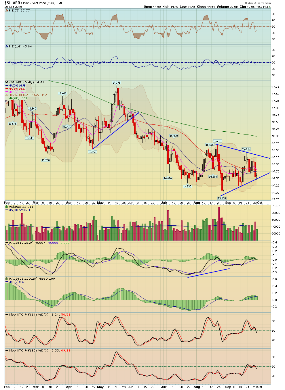 Silber sieht eindeutig noch schlecht aus. Die 14-14,50 haben vorerst gehalten, aber das Kursziel aus der SKS hat noch bestand und das Ziel wäre bei ca.13$...Der Abwärtskanal passt ebenfals dazu. Nach 13 wäre dann die 10$ dran, wo wir spätestens dort wieder drehen würden. Das würde zu Dax 8000-8500 passen und dort kommt dann wieder die Druckerpresse. Passt schon...!