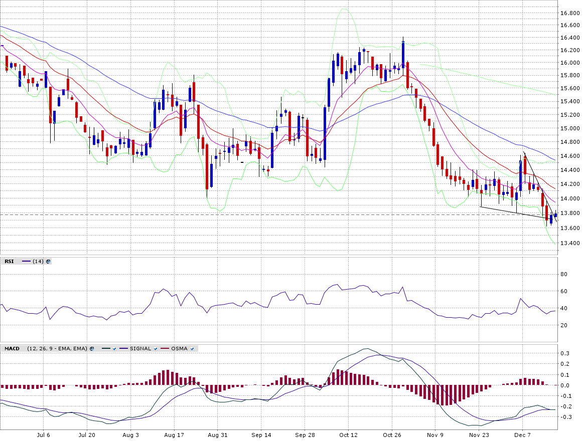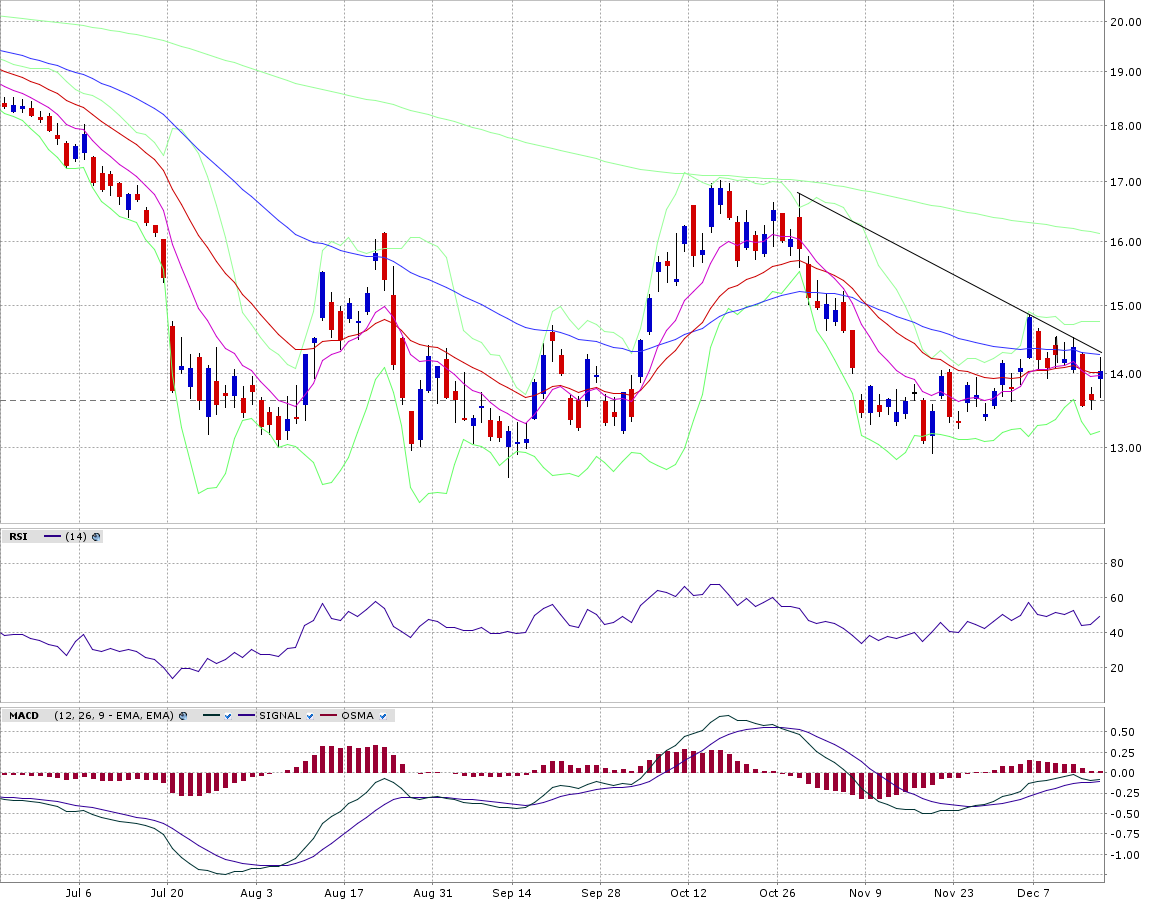 Da ich einen rechten Haufen Tradingpositionen habe, ist mir schon wichtig, ob die nächsten 10 % aufwärts oder abwärts sind. Obwohl sich Gold, Silber und USD eigentlich noch immer achtbar halten, sind Goldaktien in dieser Woche arg zersaust worden. Zurzeit sind wir genau im Niemandland. Ich werde den Verlauf genau beobachten. GDX: Unterhalb von 13.80 werde ich mich auf ein starkes Abbauen der Positionen konzentrieren. Ein Ausbruch auf über 14.40 würde dem bullischen Szenario enorm helfen (Ziel kurzfristig ca. 16$, evt. gar gegen 17$)