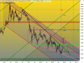 So gesehen ist es nicht unwahrscheinlich dass Gold in einigen Monaten, also gegen Ende 2016, nochmals das Tief ansteuert oder gar unterschreitet. Denn so wie es aussieht, könnten die steilen Widerstandslinien zwar überschritten werden, dann aber werden diese Widerstandslinien nur von etwas flacheren abgelöst.