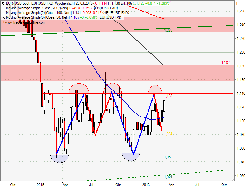 Hier noch was zum €/$...tja, die M-Formation hat wohl keinen Bestand und es geht wieder Richtung 1,14 wenn nicht sogar 1,18...das könnte mit Hoch zwischen 1320-1400 passen. Hier sieht man klar, dass man alles schön in Gleichschritt kontroliert. Eurogold will man wohl auch nicht ausbrechen lassen.