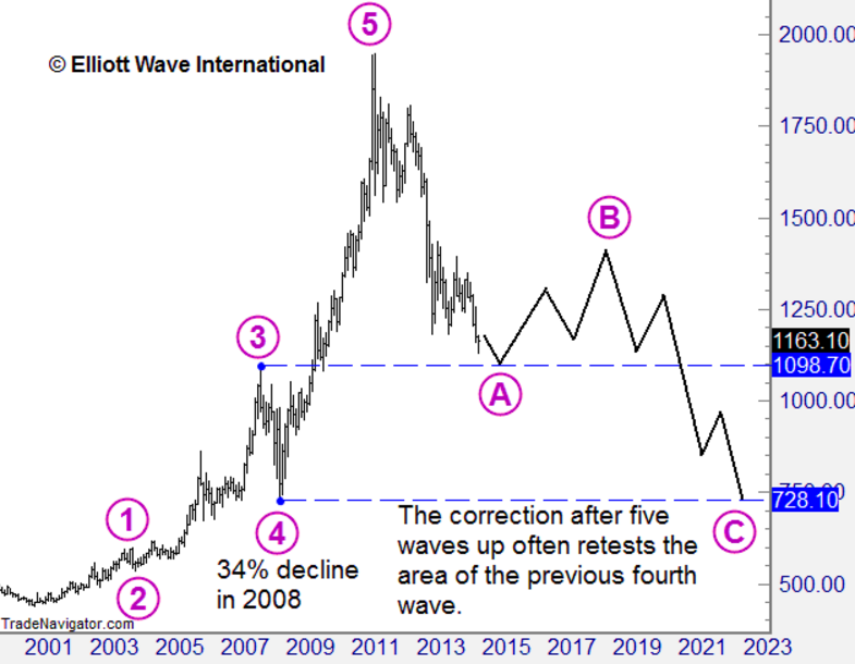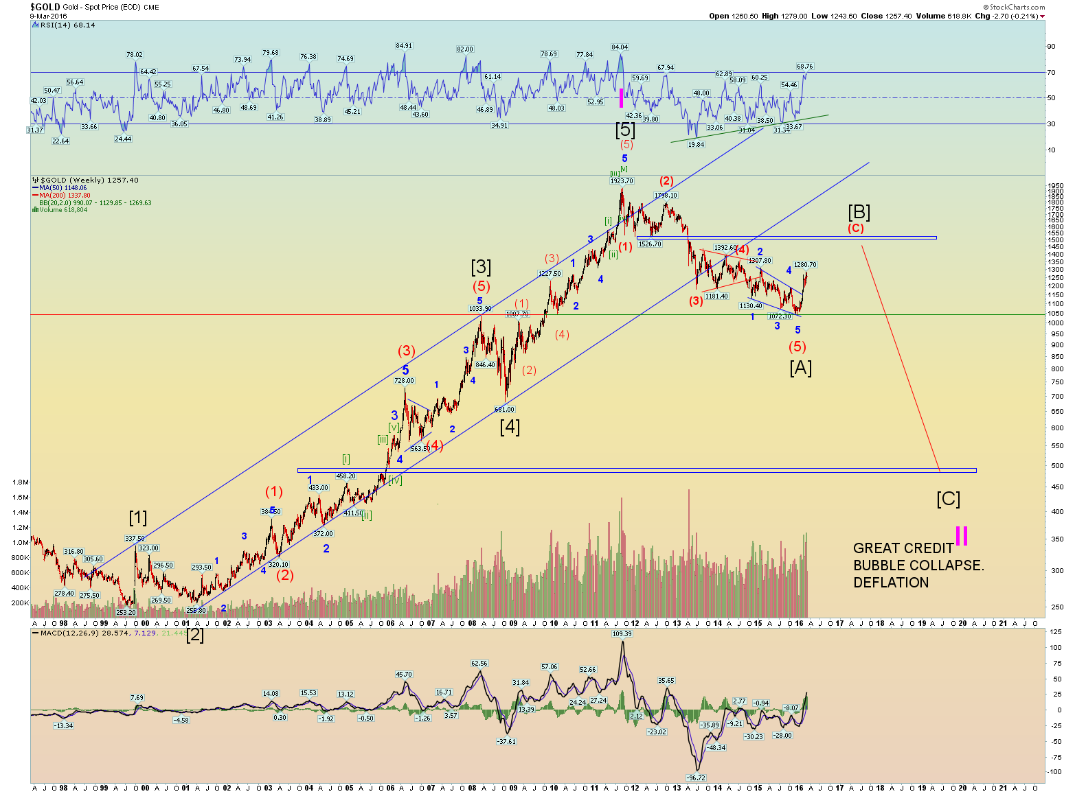 b) ein paar sind bullisch mit Ziel um die 1500 USD für Gold, sehen aber noch in der Korrektur seit dem Hoch 2011, dazu passt Chart von Robert Prechter @ Elliott Wave International