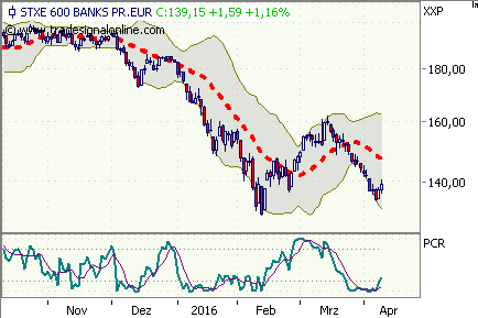 Negativ: TIPS etwas schwach, USD Yen steigt, Banken eher aufwärts, Widerstand: Oberes Bollinger Band