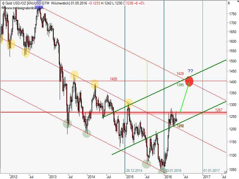 • Und wieder eine Woche um..bis Donnerstag lief alles top, und dann kam es wieder in USA zur altbekannten Drückung. Man sieht wie wichtig wohl die Marke ist. Esbraut sich hier zusammen. Gelingt der Durchbruch? Schwer zu sagen, aber der Glaube fehlt mir. Das Ende des Monats rückt näher und die Kerze wie sie jetzt aussieht, sieht verdammt scheiße aus. Eine Umkehrfunktion. Dann folgt der Mai und Juni, teils auch noch juli, die meistens schwache Monate sind. Wird dann der Herbst den Durchbruch bringen?? Meine Prognose ist bis jetzt aufgegangen, Bodenbildung bis max.1440 in 2016