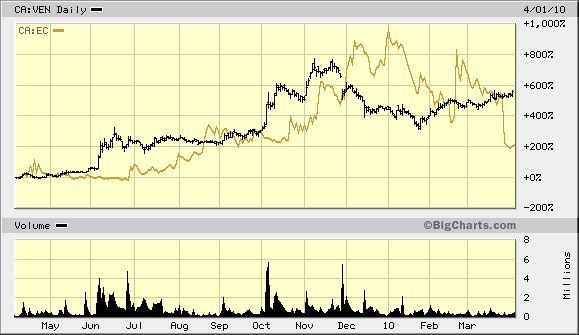 Ein Vergleich zu Ventana zeigt, daß selbst bei den extrem guten Ergebnissen dort Kursrückgänge von 50 % erfolgten....