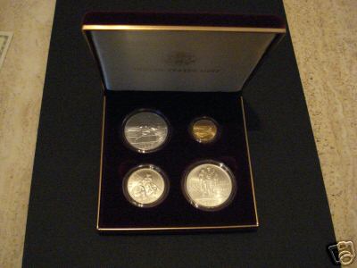 Die Münzen sind in einem einwantfreiem Zustand und die Hartplastik Hüllen wurde noch nie geöffnet. Die Münzen befinden sich in einer wunderschönen dunkelroten Samtbox, die mit einem Klappdeckel schließt. Diese wiederum befindet sie in einem kleinen Karton, so dass auch die Samtbox geschützt ist. Natürlich haben die Münzen auch ein Zertifikat, wo ihre Echtheit von der Unitet States Mint bestätigt wird. Die Münzen wurden 1995 direkt von der Mint gekauf. Diese Sets werden hier in Deutschland so gut wie gar nicht angeboten und in Amerika über 1000 $ gehandelt.