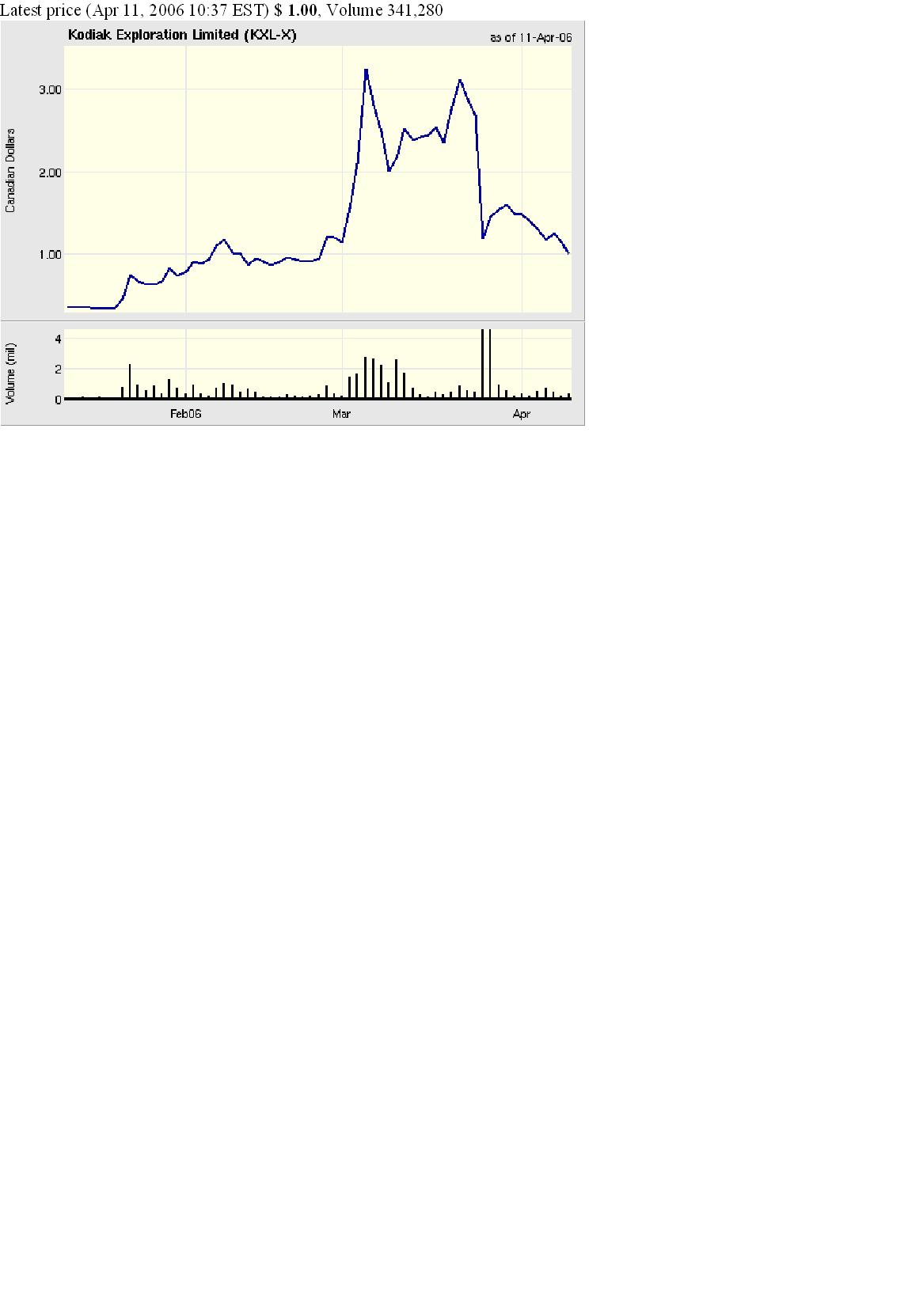 hares of Kodiak Exploration slipped C$1.50 to close at C$1.19 on massive volume of 4 million shares (equal to about 14% of all outstanding shares). While the stock had bounced back to C$1.55 by mid-day Tuesday, the initial assay results show that investors have gotten ahead of themselves.