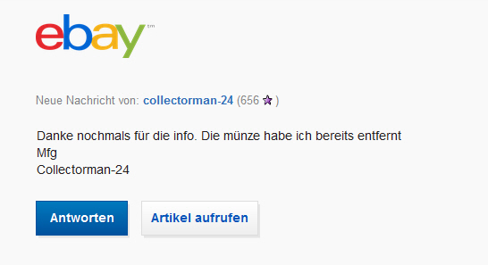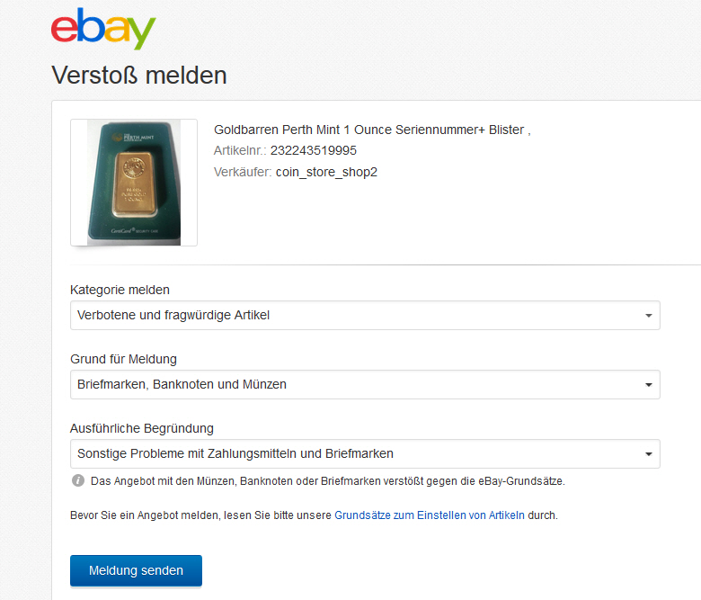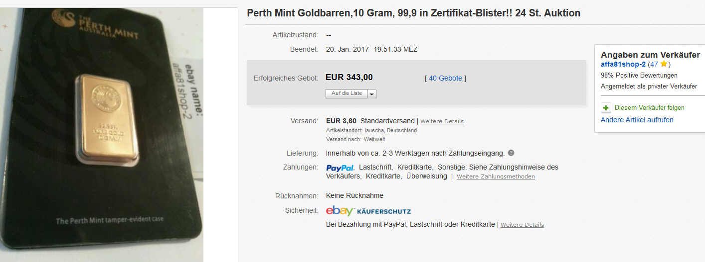 btw.ZitatBei den Angaben der Artikelmerkmale stütze ich mich auf den Aufdruck der Blisterkarte. Um den Originalzustand zu erhalten wurde die Zertifikat-Blisterkarte nicht geöffnet d.h. das auch keine Prüfung vorgenommen wurde und der Goldbarren somit ausdrücklich als unecht verkauft wird. Bitte nur dann bieten wenn Sie mit den Angaben einverstanden sind.