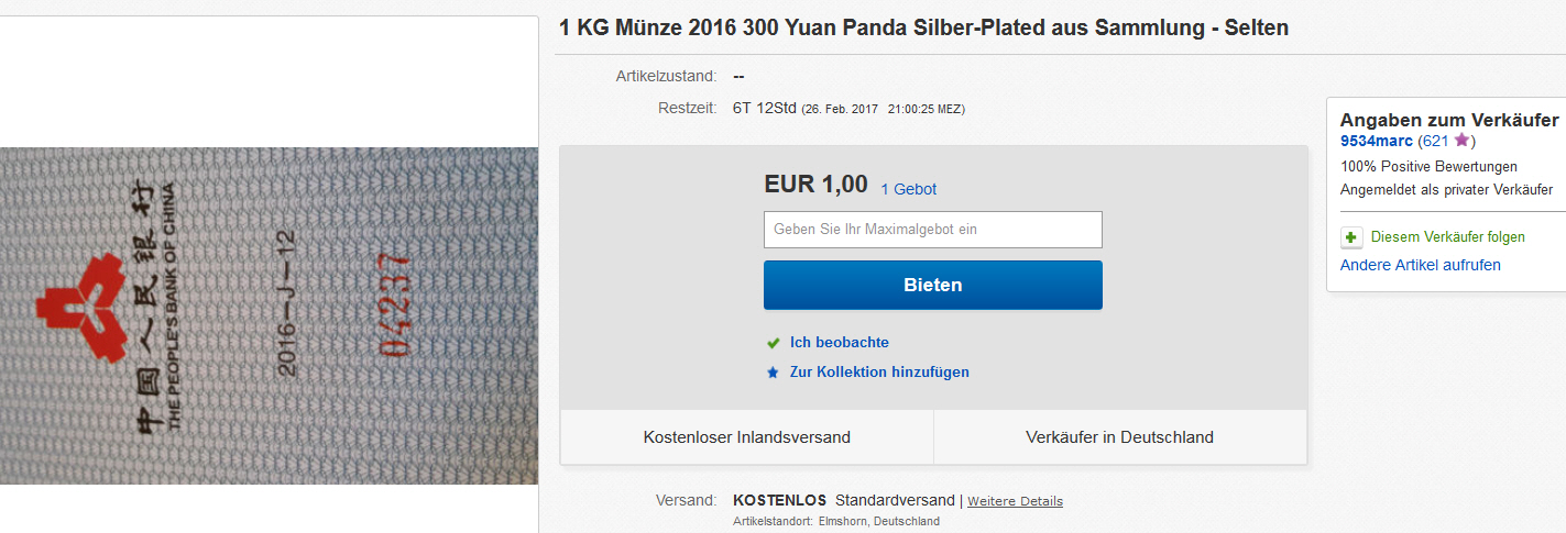 1 Zertifikat (chinesisch und englisch), 1 Umkarton, 1 chinesisches Sackerl.Der offizielle Kilopreis für z.B. Kookabura oder Silberbarren oder andere Kilostücke