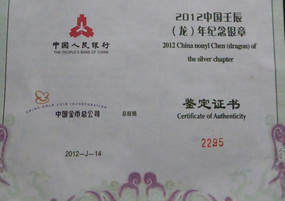 Beschriftung Umkarton: 2012 China Ren chen (Dragon) year Silver medalHöchste Prägequalität: Polierte Platte [PP]