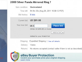 You are bidding on a NOT GENUINE 2000 Silver Panda Mirrored Ring (Very Rare). This is an incredible coin and fooled me. I am lucky...or unlucky enough to have a few of these that I now use as a tool to spot fakes. Don't miss out, still double sealed and would definetly fool most, but do the right thing!!!