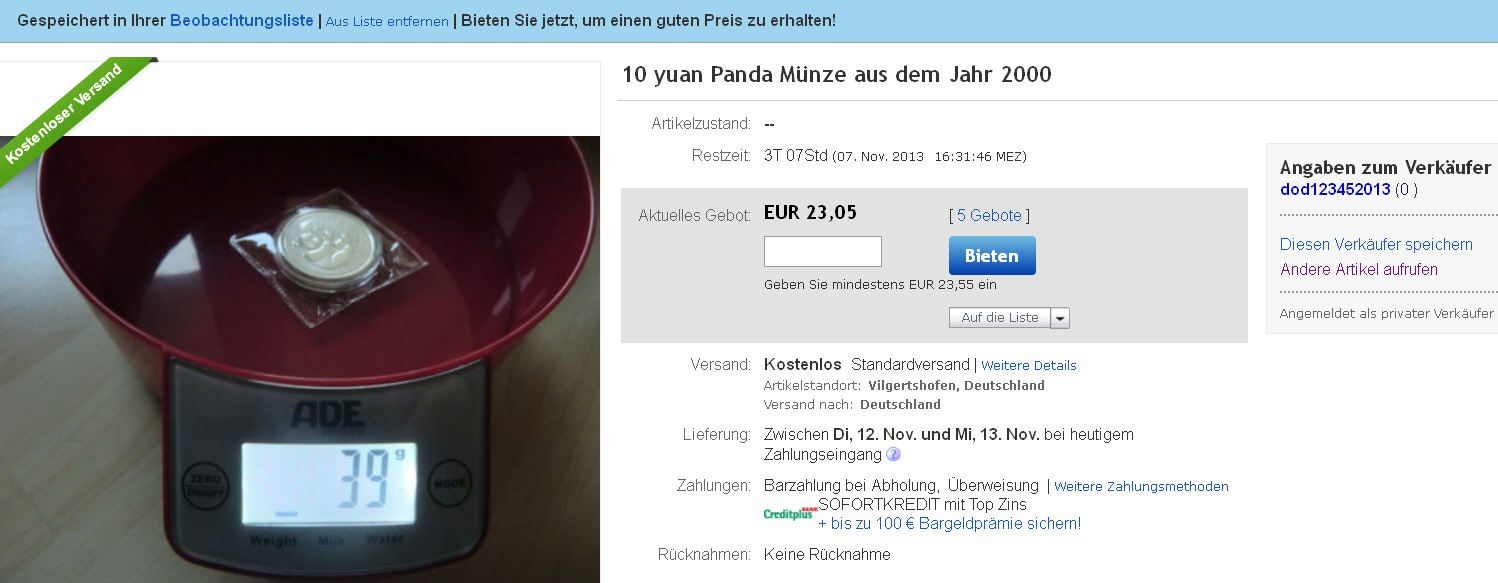 Die Münze ist aus echtem Silber und ich habe diese von einem seriösen Ebay-Verkäufer für 190 € gekauft.