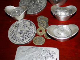 "Riesiger Posten von Münzrepliken zu seltenen chinesischen Cashs, Dollars, Taels, Spaten, Sycees, Messermünzen, japan. Yen, usw. 395 Stück. Gesamtgewicht ca. 8,5 Kilo. untersch. erh." Startpreis 90 Euro