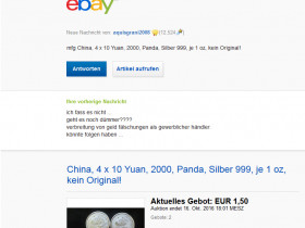 hey wg Grüße, das bezieht sich auf den von mir erfragten panda oben? na nur gut das der Verkäufer eine auktion wollte und auf mein Angebot nicht eingegangen ist. ach ja.. er kenne sich mit Münzen nicht so aus sagte er
