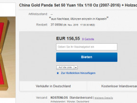 Die Münzen stammen aus einem Nachlass.Zitat von steve-bluntChina Panda Gold Setbestehend aus 5 Münzen Gold plated mit einemMünzgewicht zu je 1g, 3g, 8g, 15g und 30g. China Panda Gold Setbestehend aus 5 Münzen Gold plated mit einemMünzgewicht zu je 1g, 3g, 8g, 15g und 30g. Alle 5 Münzen aus dem Jahr 2016 einzeln in Kapseln,